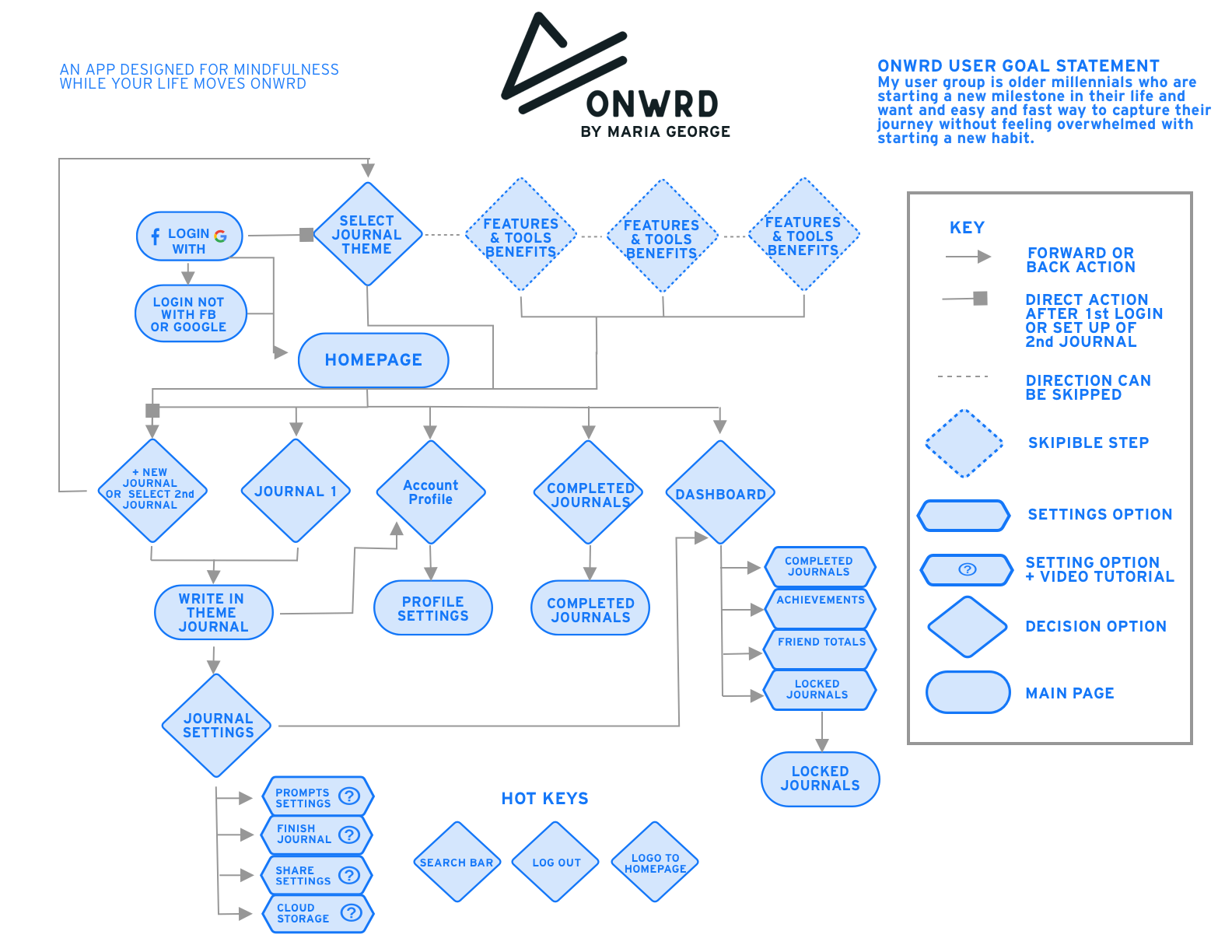 Overall, my goal was to define the new millennial milestone and create a journaling app that easily helped users capture life's moments that usually get missed when life gets busy while working toward their next big milestone. Check out the video overview to learn more about ONWRD and keep scrolling to get even more details.